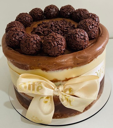 Bolo naked serve 20 fatias no sabor de 4 leites com brigadeiro gourmet e ninho.